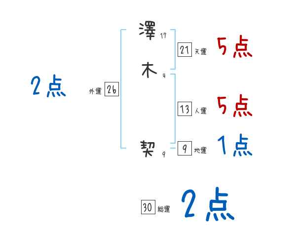 総運![]() | 澤木契さんの総運は30画の2つ星!浮き沈みの激しさに注意しましょう。 あなたの人生を表す1番重要な運勢です。生涯を通じて影響する総合運となり、主に50歳以降の晩年期に影響を及ぼします。 |