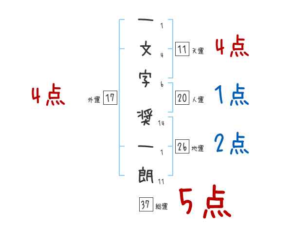 天運![]() | 一文字奨一朗さんの天運は11画の4つ星!着実に富や地位を得る幸運な人生。 家系が持つ宿命的な運勢を表します。祖先から受け継いだ苗字ですので自分の力が及びません。家柄を象徴します。 |