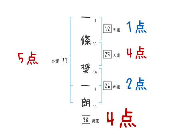 天運![]() | 一條奨一朗さんの天運は12画の1つ星!簡単な失敗で諦めてしまいやすいかも。着実に行動すると良いでしょう。 家系が持つ宿命的な運勢を表します。祖先から受け継いだ苗字ですので自分の力が及びません。家柄を象徴します。 |