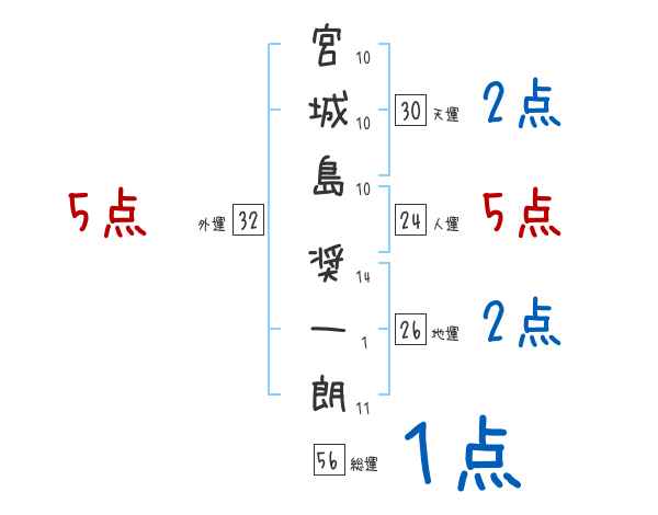 外運![]() | 宮城島奨一朗さんの外運は32画の5つ星!柔軟性があり成功する。チャンスが多く金運が良い。 生活面を象徴する運勢です。外部から受ける影響力を表し、結婚運、家庭運や職場、環境への順応性を表します。 |