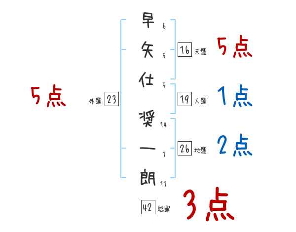 外運![]() | 早矢仕奨一朗さんの外運は23画の5つ星!想像力に優れ活力がある。一代で成功し名誉を手に入れる。 生活面を象徴する運勢です。外部から受ける影響力を表し、結婚運、家庭運や職場、環境への順応性を表します。 |