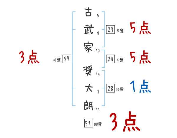 天運![]() | 古武家奨大朗さんの天運は23画の5つ星!想像力に優れ活力がある。一代で成功し名誉を手に入れる。 家系が持つ宿命的な運勢を表します。祖先から受け継いだ苗字ですので自分の力が及びません。家柄を象徴します。 |