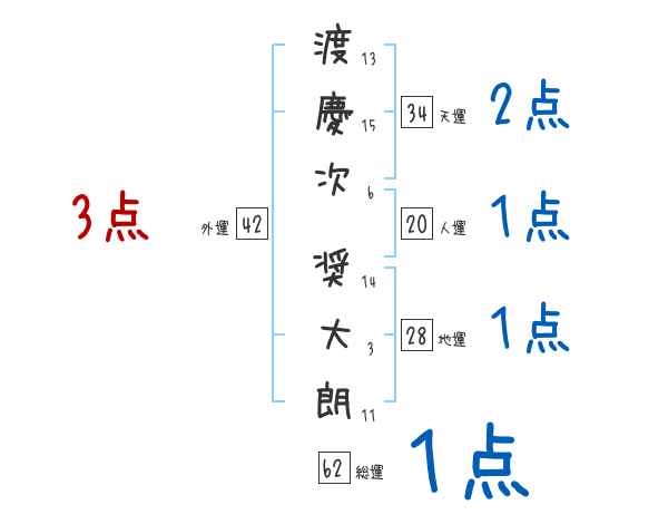 天運![]() | 渡慶次奨大朗さんの天運は34画の2つ星!独創性に優れるが、自尊心が強く災難に注意しましょう。 家系が持つ宿命的な運勢を表します。祖先から受け継いだ苗字ですので自分の力が及びません。家柄を象徴します。 |