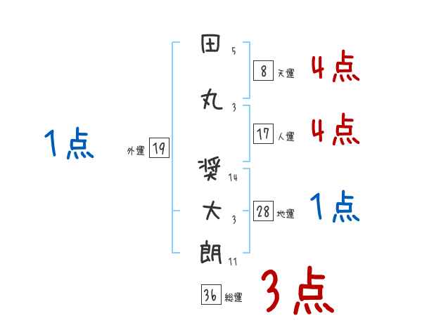 外運![]() | 田丸奨大朗さんの外運は19画の1つ星!優れた才能を持ちますが、協調性が足りないことも。周りの人と協力する事を意識しましょう。 生活面を象徴する運勢です。外部から受ける影響力を表し、結婚運、家庭運や職場、環境への順応性を表します。 |