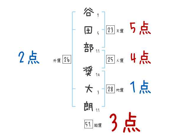 天運![]() | 谷田部奨大朗さんの天運は23画の5つ星!想像力に優れ活力がある。一代で成功し名誉を手に入れる。 家系が持つ宿命的な運勢を表します。祖先から受け継いだ苗字ですので自分の力が及びません。家柄を象徴します。 |