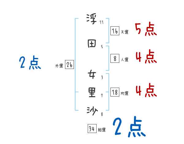 外運![]() | 浮田女里沙さんの外運は26画の2つ星!波瀾万丈かも。信頼できる人を大事にしましょう。 生活面を象徴する運勢です。外部から受ける影響力を表し、結婚運、家庭運や職場、環境への順応性を表します。 |