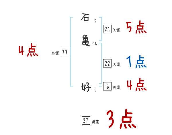 人運![]() | 石亀好さんの人運は22画の1つ星!努力することが苦手ないっぽう手先が器用。芸術性にも優れる。 性格や才能などを表す2番目に重要な運勢です。人間関係や協調性、社会的な成功に影響します。主に20歳から50歳ぐらいまでの中年期の運勢を表します。 |