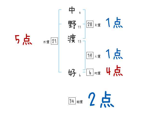 外運![]() | 中野渡好さんの外運は21画の5つ星!統率力がある。独立し成功する。名誉を手に入れる。 生活面を象徴する運勢です。外部から受ける影響力を表し、結婚運、家庭運や職場、環境への順応性を表します。 |