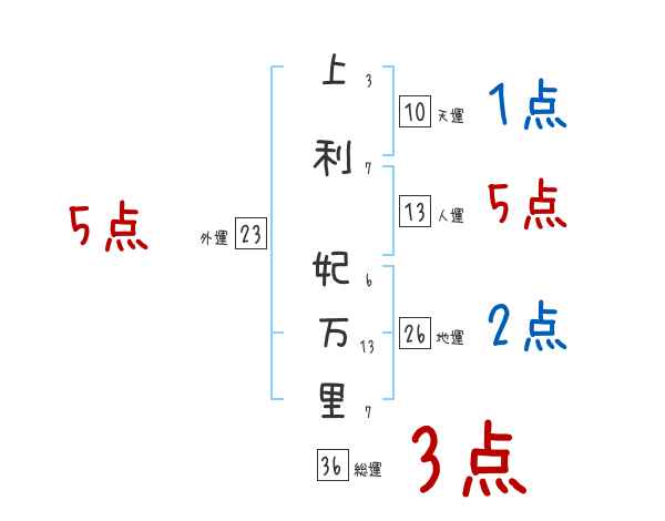 総運![]() | 上利妃万里さんの総運は36画の3つ星!先見性が豊かです。多少神経質で苦労することも。 あなたの人生を表す1番重要な運勢です。生涯を通じて影響する総合運となり、主に50歳以降の晩年期に影響を及ぼします。 |