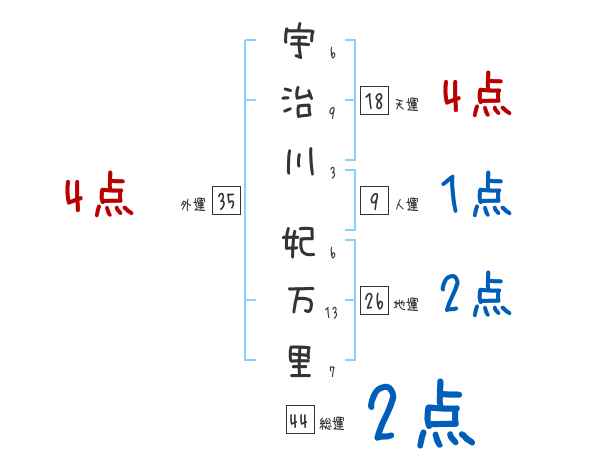 総運![]() | 宇治川妃万里さんの総運は44画の2つ星!誠実で慎重な性格。物事を考えすぎないように注意しましょう。 あなたの人生を表す1番重要な運勢です。生涯を通じて影響する総合運となり、主に50歳以降の晩年期に影響を及ぼします。 |