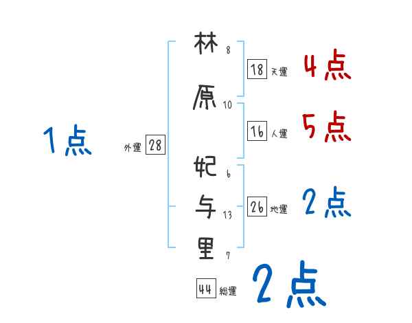 天運![]() | 林原妃与里さんの天運は18画の4つ星!情熱的で剛気。忍耐力があり信頼される。 家系が持つ宿命的な運勢を表します。祖先から受け継いだ苗字ですので自分の力が及びません。家柄を象徴します。 |