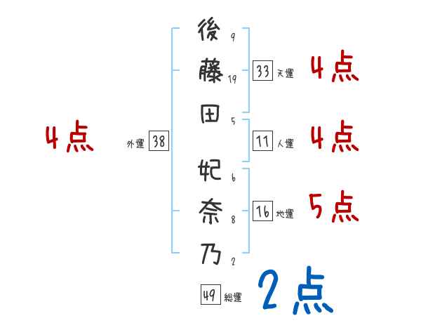 総運![]() | 後藤田妃奈乃さんの総運は49画の2つ星!不安定な性格で明暗がある人生。周りの人には支援されやすい。 あなたの人生を表す1番重要な運勢です。生涯を通じて影響する総合運となり、主に50歳以降の晩年期に影響を及ぼします。 |