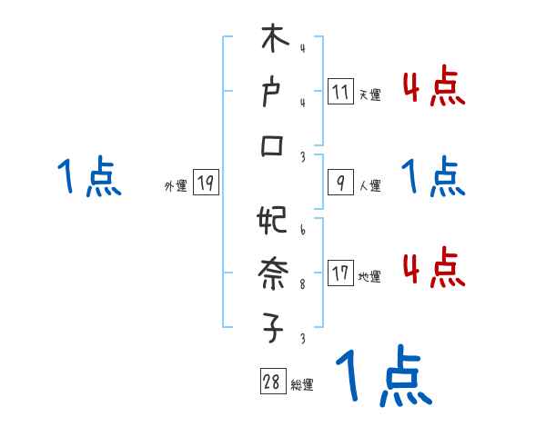 天運![]() | 木戸口妃奈子さんの天運は11画の4つ星!着実に富や地位を得る幸運な人生。 家系が持つ宿命的な運勢を表します。祖先から受け継いだ苗字ですので自分の力が及びません。家柄を象徴します。 |