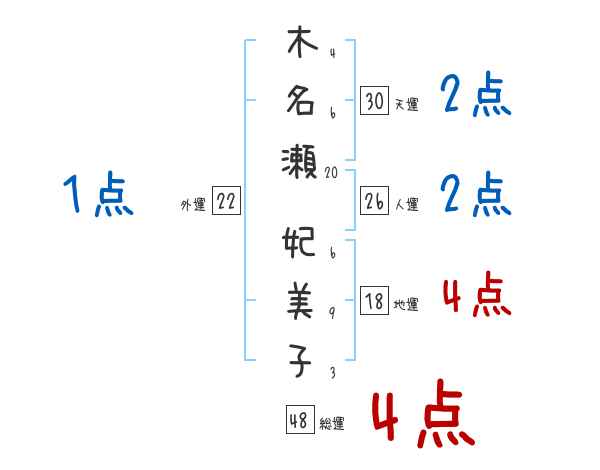 天運![]() | 木名瀬妃美子さんの天運は30画の2つ星!浮き沈みの激しさに注意しましょう。 家系が持つ宿命的な運勢を表します。祖先から受け継いだ苗字ですので自分の力が及びません。家柄を象徴します。 |