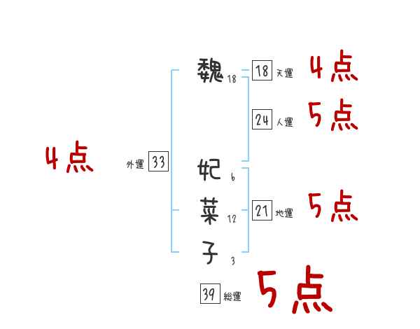 外運![]() | 魏妃菜子さんの外運は33画の4つ星!権力志向でプライドが高い。勇気があり運を切り開き成功する。 生活面を象徴する運勢です。外部から受ける影響力を表し、結婚運、家庭運や職場、環境への順応性を表します。 |