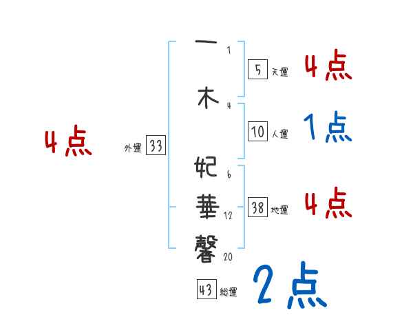 総運![]() | 一木妃華馨さんの総運は43画の2つ星!頑固な性格で独立心が強いかも。やや非現実的で浪費に注意しましょう。 あなたの人生を表す1番重要な運勢です。生涯を通じて影響する総合運となり、主に50歳以降の晩年期に影響を及ぼします。 |