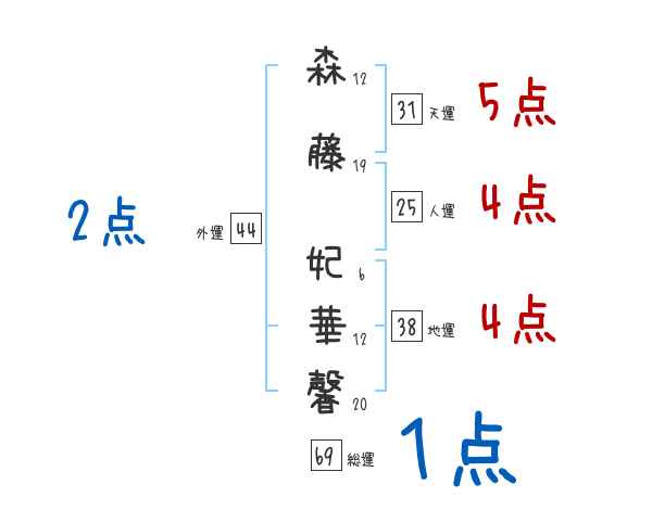 総運![]() | 森藤妃華馨さんの総運は69画の1つ星!不満を感じやすい傾向が。ストレスを貯めないように注意しましょう。 あなたの人生を表す1番重要な運勢です。生涯を通じて影響する総合運となり、主に50歳以降の晩年期に影響を及ぼします。 |