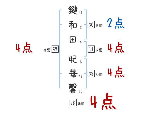 天運![]() | 鍵和田妃華馨さんの天運は30画の2つ星!浮き沈みの激しさに注意しましょう。 家系が持つ宿命的な運勢を表します。祖先から受け継いだ苗字ですので自分の力が及びません。家柄を象徴します。 |