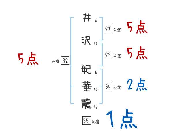 外運![]() | 井沢妃華龍さんの外運は32画の5つ星!柔軟性があり成功する。チャンスが多く金運が良い。 生活面を象徴する運勢です。外部から受ける影響力を表し、結婚運、家庭運や職場、環境への順応性を表します。 |