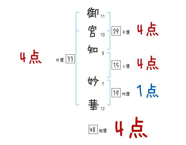 天運![]() | 御宮知妙華さんの天運は29画の4つ星!完全主義で才能がある。厳格な心の持ち主。 家系が持つ宿命的な運勢を表します。祖先から受け継いだ苗字ですので自分の力が及びません。家柄を象徴します。 |