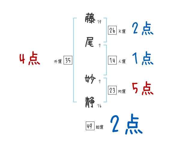 外運![]() | 藤尾妙静さんの外運は35画の4つ星!温厚な性格で感受性が高い。穏和な性格で人望が厚い。 生活面を象徴する運勢です。外部から受ける影響力を表し、結婚運、家庭運や職場、環境への順応性を表します。 |