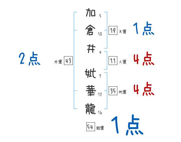 地運![]() | 加倉井妣華龍さんの地運は35画の4つ星!温厚な性格で感受性が高い。穏和な性格で人望が厚い。 個性を表す基礎的な運勢です。性格形成や対人関係、行動力など家庭環境に影響されます。主に誕生してから20歳くらいまでの若年期の運勢を表します。 |