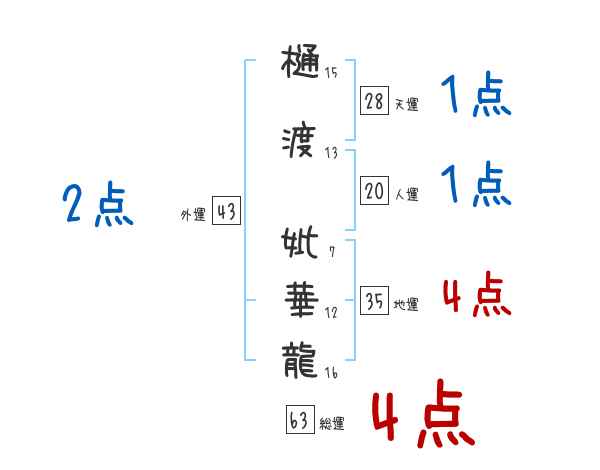 天運![]() | 樋渡妣華龍さんの天運は28画の1つ星!家庭環境に注意。スポーツで活躍できる能力があるかも。 家系が持つ宿命的な運勢を表します。祖先から受け継いだ苗字ですので自分の力が及びません。家柄を象徴します。 |
