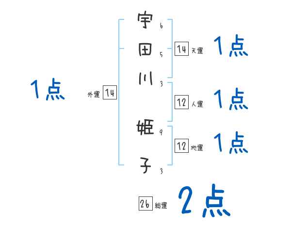 総運![]() | 宇田川姫子さんの総運は26画の2つ星!波瀾万丈かも。信頼できる人を大事にしましょう。 あなたの人生を表す1番重要な運勢です。生涯を通じて影響する総合運となり、主に50歳以降の晩年期に影響を及ぼします。 |