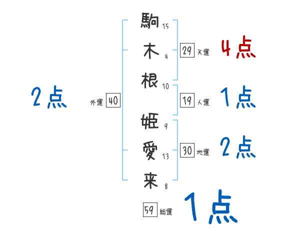 天運![]() | 駒木根姫愛来さんの天運は29画の4つ星!完全主義で才能がある。厳格な心の持ち主。 家系が持つ宿命的な運勢を表します。祖先から受け継いだ苗字ですので自分の力が及びません。家柄を象徴します。 |