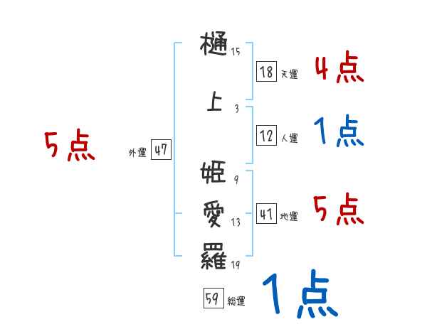 外運![]() | 樋上姫愛羅さんの外運は47画の5つ星!実力が開花し発展する円満な人生。財に恵まれる。 生活面を象徴する運勢です。外部から受ける影響力を表し、結婚運、家庭運や職場、環境への順応性を表します。 |