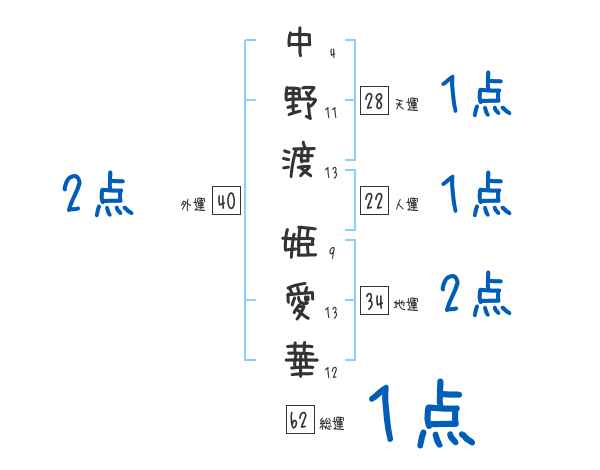 天運![]() | 中野渡姫愛華さんの天運は28画の1つ星!家庭環境に注意。スポーツで活躍できる能力があるかも。 家系が持つ宿命的な運勢を表します。祖先から受け継いだ苗字ですので自分の力が及びません。家柄を象徴します。 |