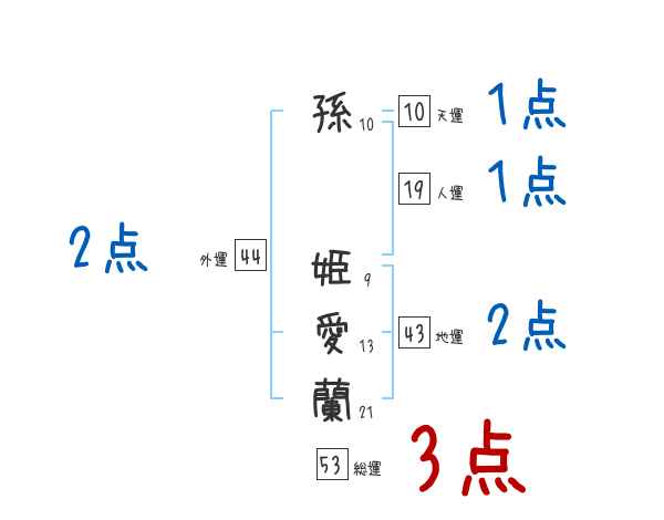 外運![]() | 孫姫愛蘭さんの外運は44画の2つ星!誠実で慎重な性格。物事を考えすぎないように注意しましょう。 生活面を象徴する運勢です。外部から受ける影響力を表し、結婚運、家庭運や職場、環境への順応性を表します。 |