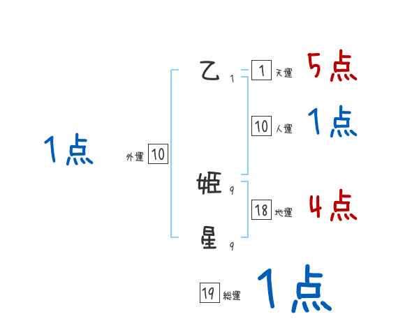 天運![]() | 乙姫星さんの天運は1画の5つ星!行動力、指導力があり出世し繁栄する。幸運に恵まれる。 家系が持つ宿命的な運勢を表します。祖先から受け継いだ苗字ですので自分の力が及びません。家柄を象徴します。 |