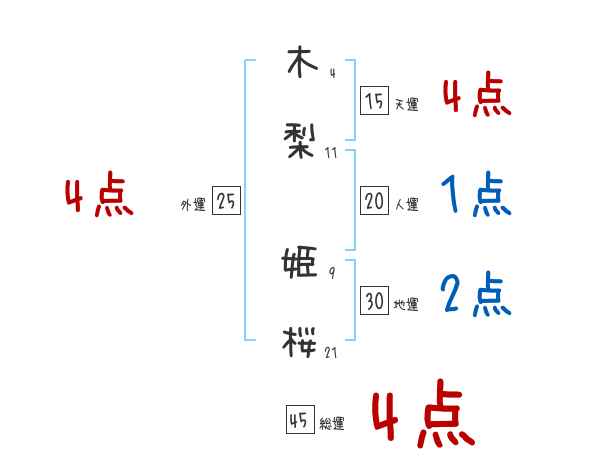 総運![]() | 木梨姫桜さんの総運は45画の4つ星!もくもくと物事を進め達成する。地味な努力家。 あなたの人生を表す1番重要な運勢です。生涯を通じて影響する総合運となり、主に50歳以降の晩年期に影響を及ぼします。 |