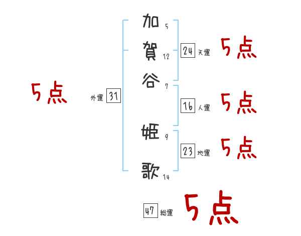 人運![]() | 加賀谷姫歌さんの人運は16画の5つ星!人望が厚く大きく発展する。逆転成功が見える。 性格や才能などを表す2番目に重要な運勢です。人間関係や協調性、社会的な成功に影響します。主に20歳から50歳ぐらいまでの中年期の運勢を表します。 |