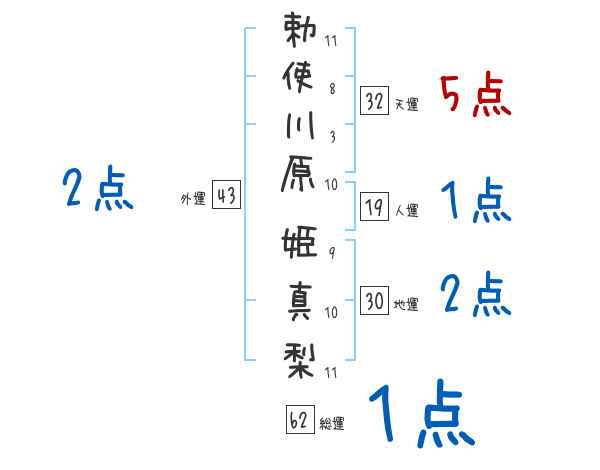 天運![]() | 勅使川原姫真梨さんの天運は32画の5つ星!柔軟性があり成功する。チャンスが多く金運が良い。 家系が持つ宿命的な運勢を表します。祖先から受け継いだ苗字ですので自分の力が及びません。家柄を象徴します。 |