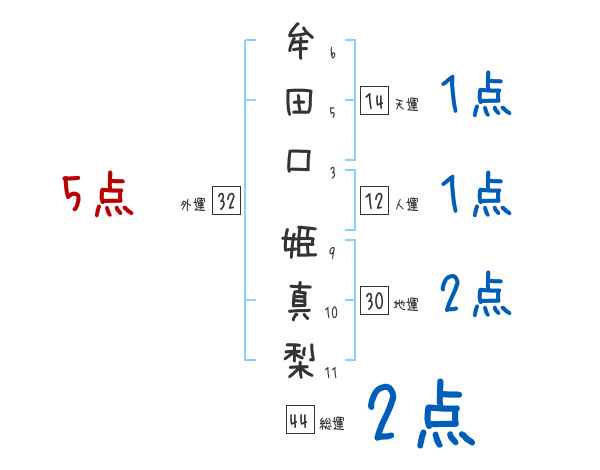 外運![]() | 牟田口姫真梨さんの外運は32画の5つ星!柔軟性があり成功する。チャンスが多く金運が良い。 生活面を象徴する運勢です。外部から受ける影響力を表し、結婚運、家庭運や職場、環境への順応性を表します。 |