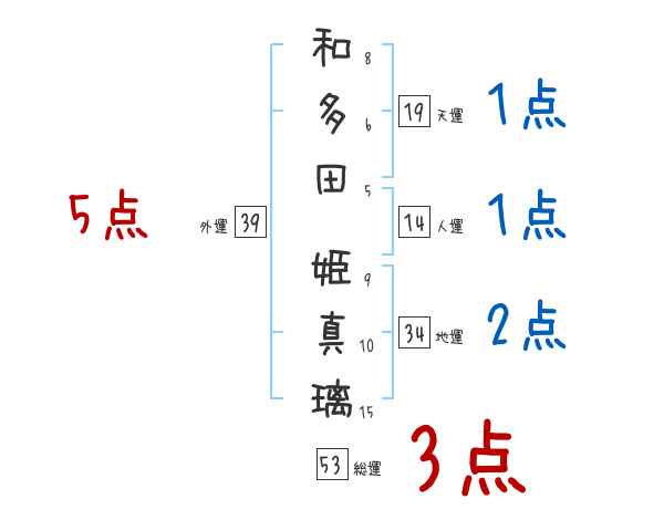 外運![]() | 和多田姫真璃さんの外運は39画の5つ星!社交性に優れ人望が厚い。人の上に立ち成功する。 生活面を象徴する運勢です。外部から受ける影響力を表し、結婚運、家庭運や職場、環境への順応性を表します。 |