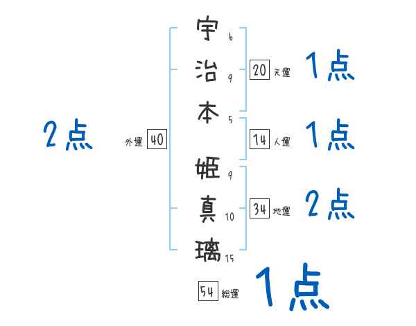 総運![]() | 宇治本姫真璃さんの総運は54画の1つ星!トラブルが多いかも。周りをよく見て協調して過ごしましょう。 あなたの人生を表す1番重要な運勢です。生涯を通じて影響する総合運となり、主に50歳以降の晩年期に影響を及ぼします。 |