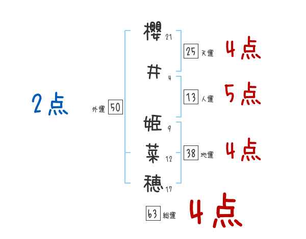 人運![]() | 櫻井姫菜穂さんの人運は13画の5つ星!才能に恵まれ人気がある。名声を手に入れる。円満な人生。 性格や才能などを表す2番目に重要な運勢です。人間関係や協調性、社会的な成功に影響します。主に20歳から50歳ぐらいまでの中年期の運勢を表します。 |