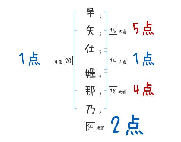 天運![]() | 早矢仕姫那乃さんの天運は16画の5つ星!人望が厚く大きく発展する。逆転成功が見える。 家系が持つ宿命的な運勢を表します。祖先から受け継いだ苗字ですので自分の力が及びません。家柄を象徴します。 |