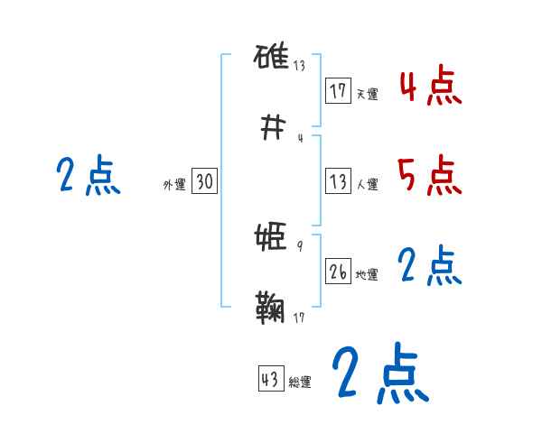 総運![]() | 碓井姫鞠さんの総運は43画の2つ星!頑固な性格で独立心が強いかも。やや非現実的で浪費に注意しましょう。 あなたの人生を表す1番重要な運勢です。生涯を通じて影響する総合運となり、主に50歳以降の晩年期に影響を及ぼします。 |
