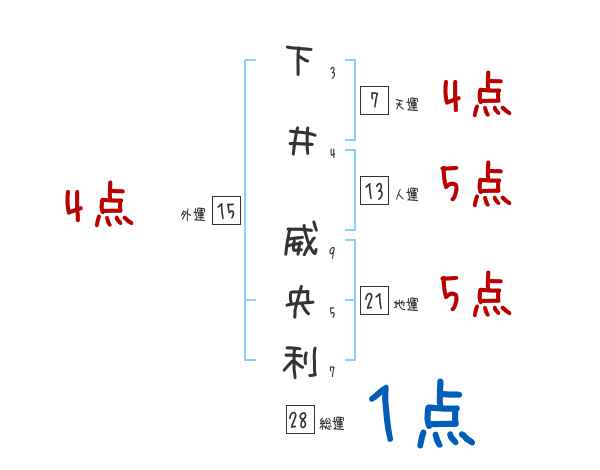天運![]() | 下井威央利さんの天運は7画の4つ星!強い意志や信念を持ち独立心が強い。自立する。 家系が持つ宿命的な運勢を表します。祖先から受け継いだ苗字ですので自分の力が及びません。家柄を象徴します。 |
