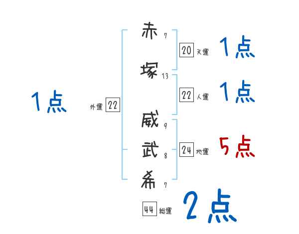 総運![]() | 赤塚威武希さんの総運は44画の2つ星!誠実で慎重な性格。物事を考えすぎないように注意しましょう。 あなたの人生を表す1番重要な運勢です。生涯を通じて影響する総合運となり、主に50歳以降の晩年期に影響を及ぼします。 |