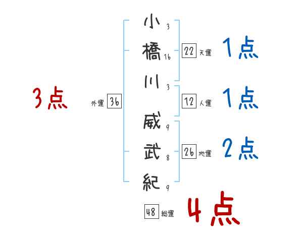 外運![]() | 小橋川威武紀さんの外運は36画の3つ星!先見性が豊かです。多少神経質で苦労することも。 生活面を象徴する運勢です。外部から受ける影響力を表し、結婚運、家庭運や職場、環境への順応性を表します。 |