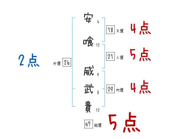 総運![]() | 安喰威武貴さんの総運は47画の5つ星!実力が開花し発展する円満な人生。財に恵まれる。 あなたの人生を表す1番重要な運勢です。生涯を通じて影響する総合運となり、主に50歳以降の晩年期に影響を及ぼします。 |