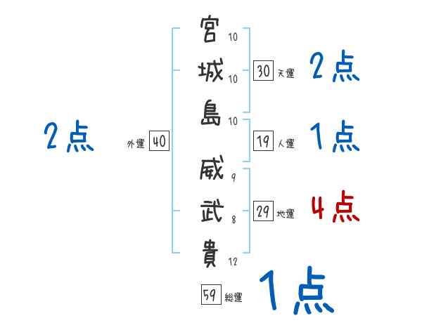 天運![]() | 宮城島威武貴さんの天運は30画の2つ星!浮き沈みの激しさに注意しましょう。 家系が持つ宿命的な運勢を表します。祖先から受け継いだ苗字ですので自分の力が及びません。家柄を象徴します。 |