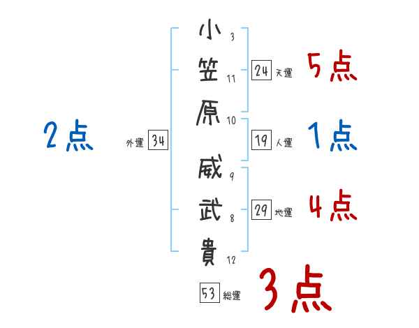 総運![]() | 小笠原威武貴さんの総運は53画の3つ星!やや見栄っ張りで虚栄心がある。散財に注意。 あなたの人生を表す1番重要な運勢です。生涯を通じて影響する総合運となり、主に50歳以降の晩年期に影響を及ぼします。 |