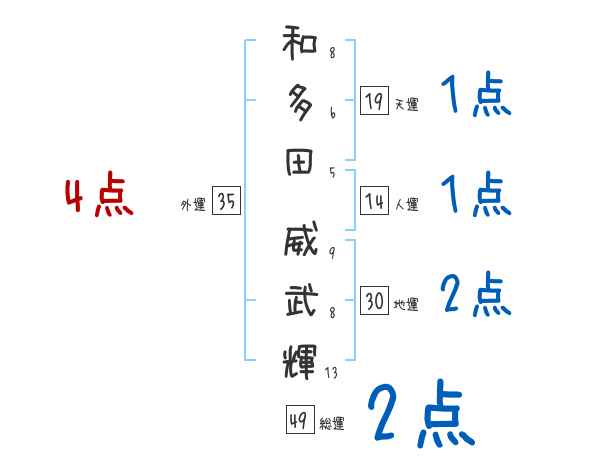 外運![]() | 和多田威武輝さんの外運は35画の4つ星!温厚な性格で感受性が高い。穏和な性格で人望が厚い。 生活面を象徴する運勢です。外部から受ける影響力を表し、結婚運、家庭運や職場、環境への順応性を表します。 |