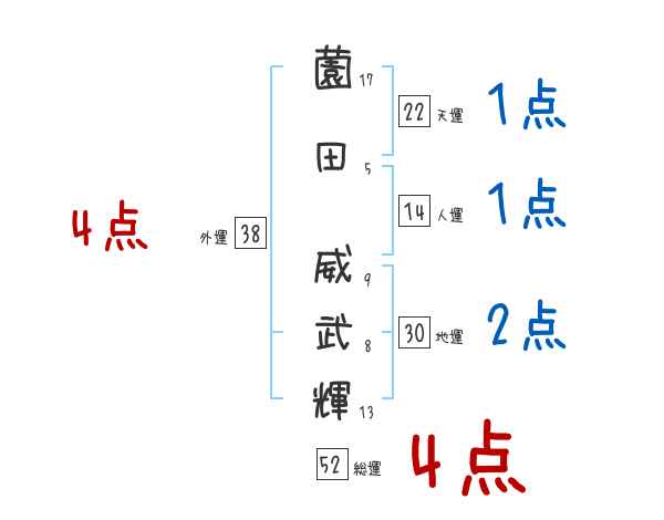 | 外運  | 薗田威武輝さんの外運は38画の4つ星!温厚な性格で技術的な才能を発揮する。職人的な仕事に向いている。生活面を象徴する運勢です。外部から受ける影響力を表し、結婚運、家庭運や職場、環境への順応性を表します。 |